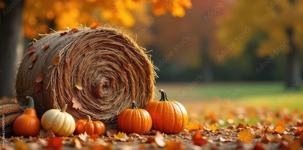 Rustic Autumn Hay Bale Decoration Fall Gourds, Pumpkins & Corn Stalks create a warm, inviting Thanksgiving and harvest scene. Perfect autumnal background for seasonal celebrations. #1580997000