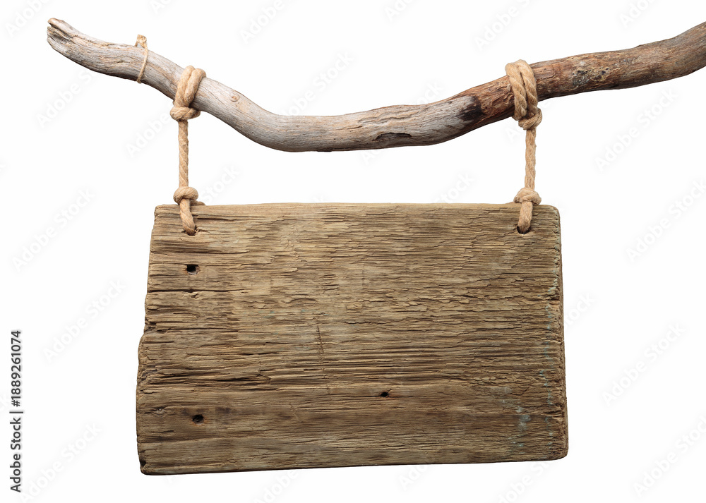 Rustic blank wooden sign hanging from a driftwood branch. Isolated on white for easy use as a template or mockup. #1889261074