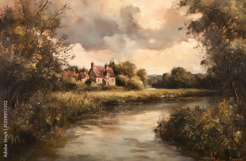 Rustic Riverside Retreat: A picturesque painting capturing a quaint cottage nestled amidst a serene riverside setting, embraced by nature's beauty and tranquility. #1359952202
