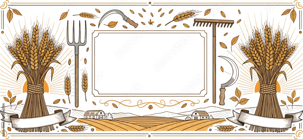 Rustic wheat harvest banner with grain sheaves farming tools countryside landscape and vintage agriculture frame illustration #1947562954