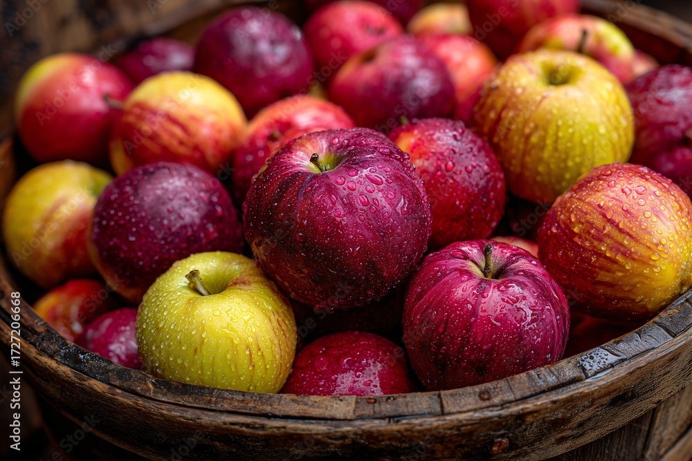 Rustic wooden basket brimming with fresh, dewy heirloom apples showcases vibrant autumn harvest. mix of red and yellow apples highlights season abundance and natural beauty #1727206668