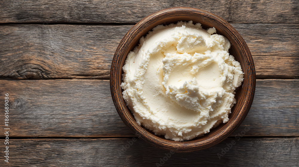 Rustic wooden bowl filled with creamy white lard, soft rendered pork fat with smooth texture, traditional cooking ingredient for baking and frying in country style kitchen. #1861689086