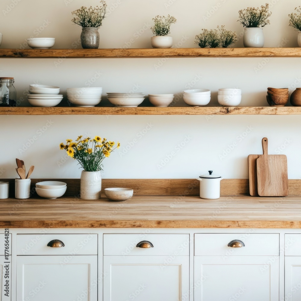 Rustic wooden kitchen counter with open shelving displaying a warm homey arrangement of tableware ceramics and floral accents creating a cozy and inviting atmosphere #1776564821