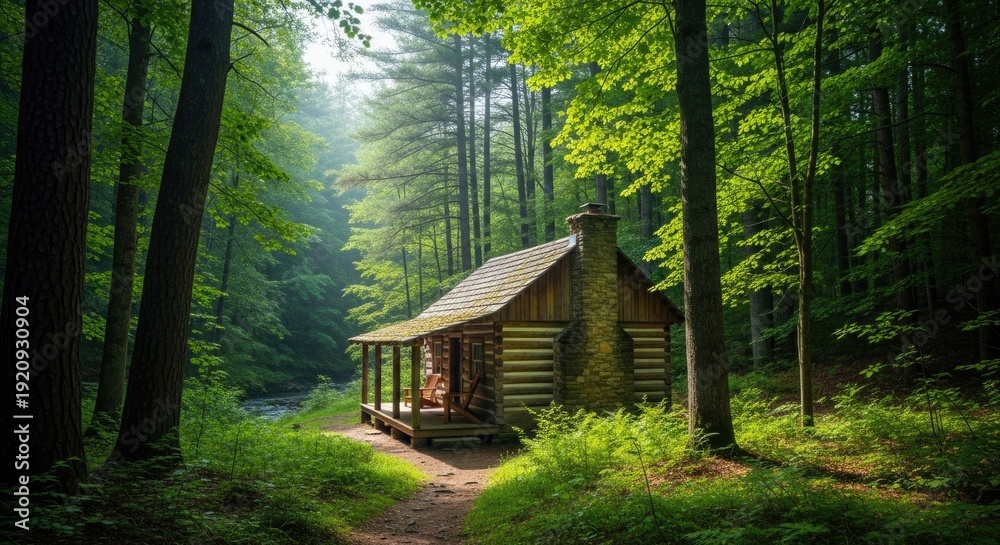 Rustic wooden log cabin nestled deep within a lush green forest with sunlight streaming through the trees creating a serene and peaceful atmosphere evoking a sense of solitude #1920930904