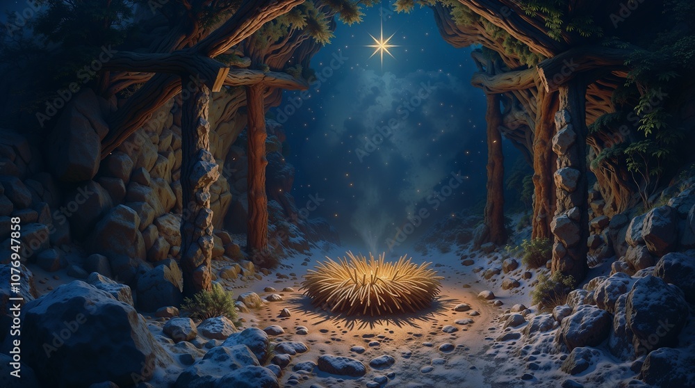 Rustic wooden nativity scene bathed in ethereal starlight and a humble nativity scene set in an atmospheric cave. a spiritual Christmas illustration #1076947858