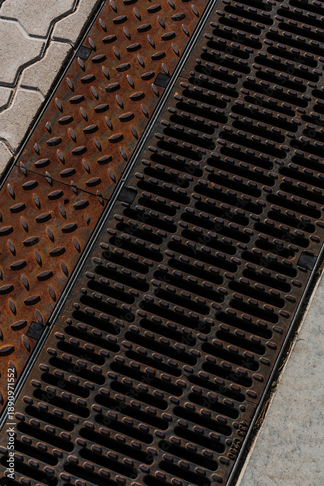 Rusty metal street grate with industrial patterns forming abstract urban ground texture #1890971552
