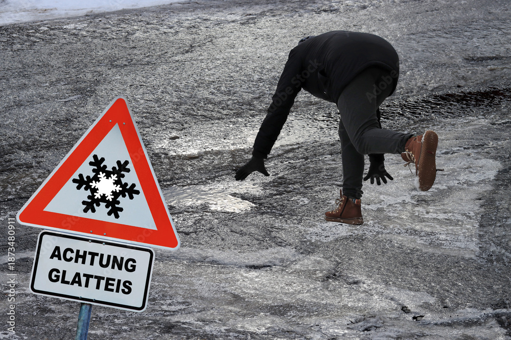 Rutschgefahr auf einem glatten Gehweg im Winter. Eine Frau ist auf dem Eis ausgerutscht. Schild mit Achtung Glatteis #1873480911