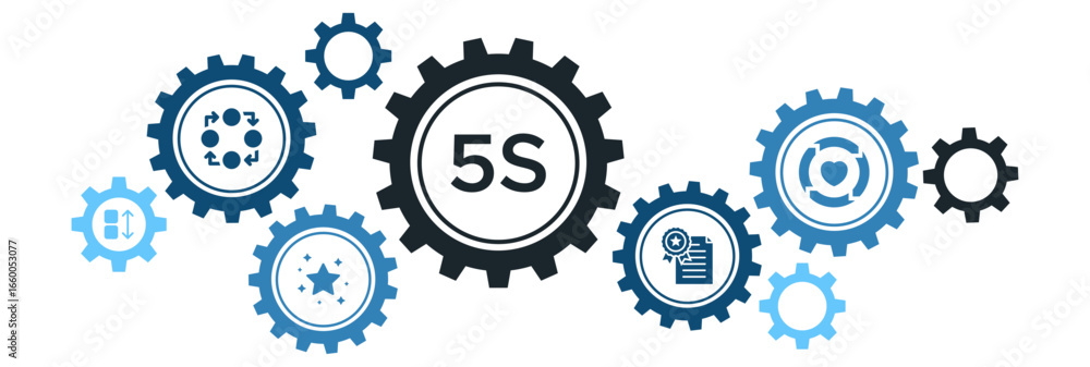 5S Lean Manufacturing Methodology Banner Vector Concept with Icons for Sorting, Organizing, Shining, Standardizing, and Sustaining Processes #1660053077