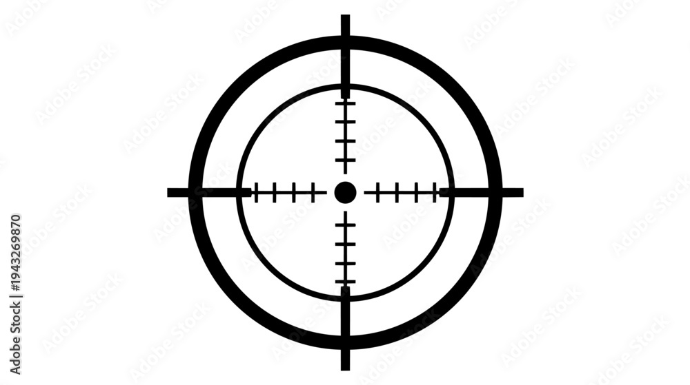 Símbolo minimalista de mira telescópica con círculos concéntricos y líneas de retícula centradas. Diseño geométrico negro aislado sobre fondo blanco que representa precisión, objetivo y enfoque. #1943269870