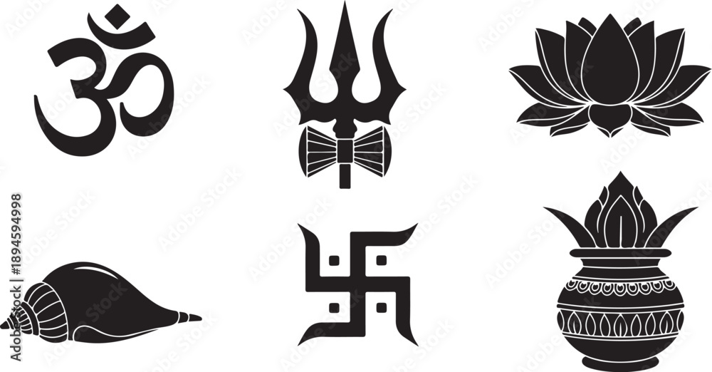 Sacred Hindu Symbols Set Om Swastika and TrishulIndian Religious Icons and Spiritual Silhouette Graphic #1894594998