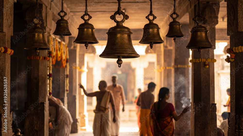 Sacred temple bells in vibrant Indian atmosphere with devotees engaged in prayer and rituals. Temple setting includes intricate architecture, flowing incense, and colorful garments. #1921628587