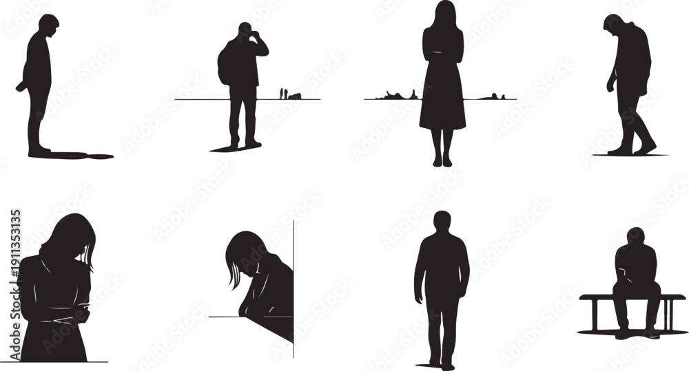 Sad People Silhouettes with Downcast Heads Isolated on White Background #1911353135