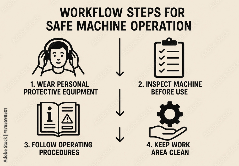 Safe machine operation steps with protective equipment inspection checklist and clean workplace procedure #1765598501