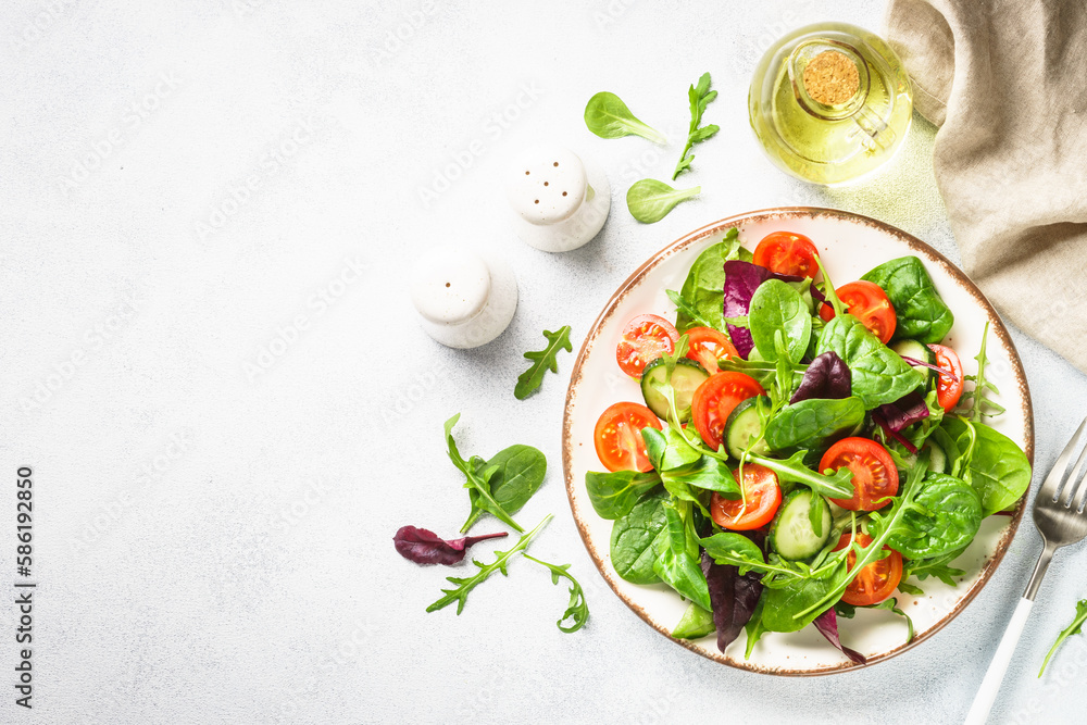 Salad from green leaves and vegetables. Fresh green salad in white plate. Top view. #586192850
