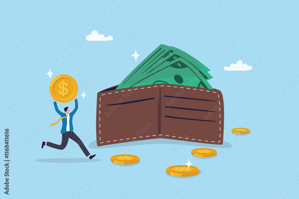 Salary, wages or income, making money profit, cash or economics, financial saving, investment or expense, spending, salary payroll, compensation concept, businessman hold money with wallet banknotes. #1168411616