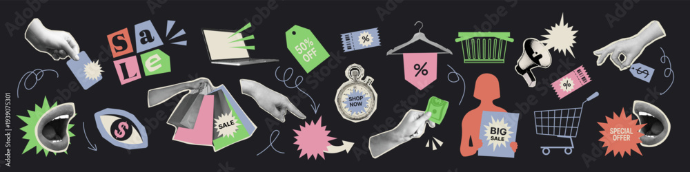 Sale and shopping collage element set. Cut out trendy illustrations with halftone hand holding a shopping bags, open mouths and cart. Modern retro vintage sticker style vector illustration. #1939075301