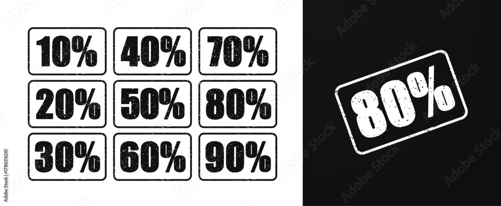 Sale banner collection. Vector ads illustration set. White text number in frame with discount symbol grunge texture isolated on background. Design element for commercial advertisement campaign #1786316261