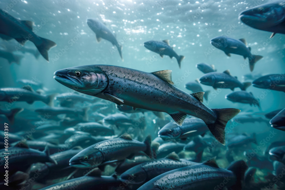 Salmon in their natural habitat within an open-sea fish pen of an aquaculture farm. Generative AI. #609351397