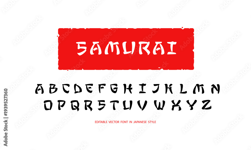 Samurai - japanese calligraphy style font type template. Alphabet letters in Japanese hieroglyphs style. Asian style Chinese or Japanese font type typography. Fully editable vector #1939527360