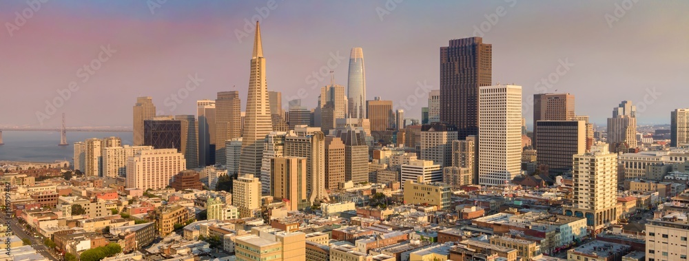 San Francisco, USA, cityscape view. The photo shows the city's iconic skyline, including the Transamerica Pyramid, Salesforce Tower, and the Bay Bridge in the distance. #1315797447