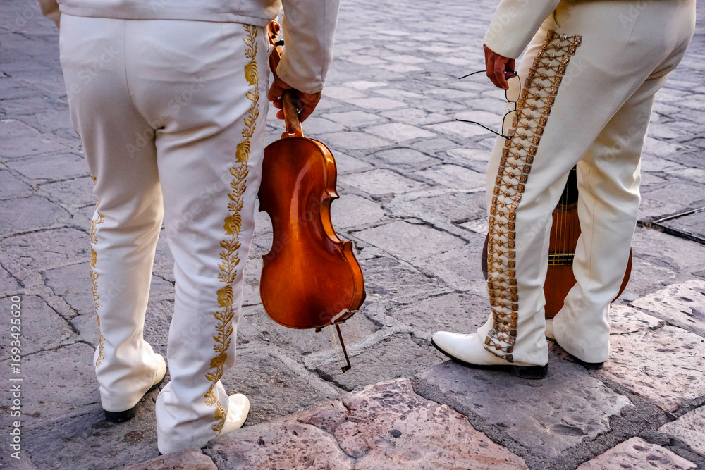 San Miguel de Allende, Mexico - February 8, 2025: Detail of a mariachi musicians with a violin in San Miguel de Allende, Guanajuato, Mexico. #1693425620