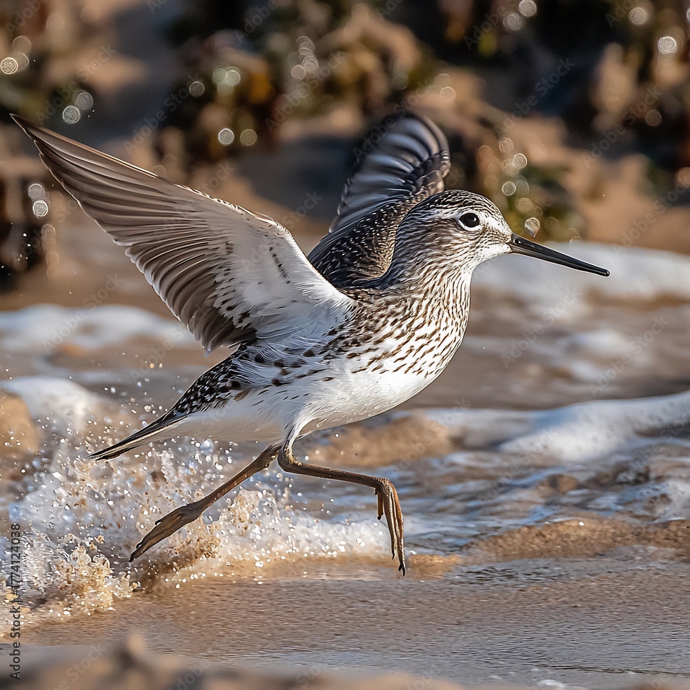 Sandpiper Bird Running Along Sandy Shoreline Near Water Edge Capturing Dynamic Flight Moments With Detailed Feathers and Morning Light In Beach Habitat #1774124038