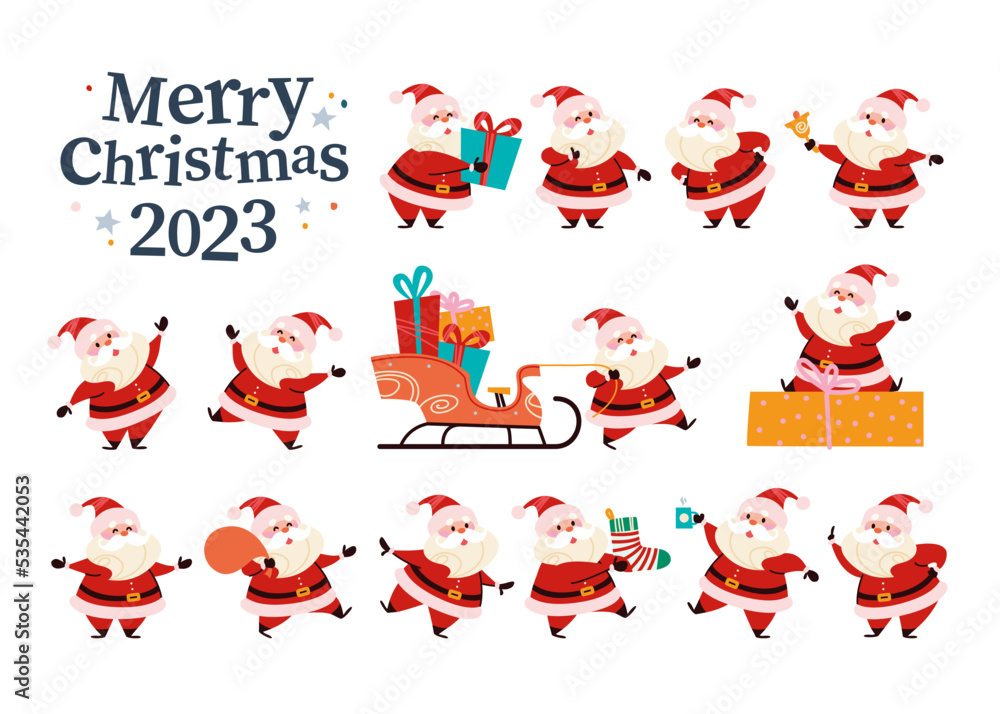 Santa Claus different characters isolated collection. Santa with gift box, bell, presents sleigh and carry Christmas stocking and gift bag. Vector flat Christmas illustration. For banner, sticker. #535442053