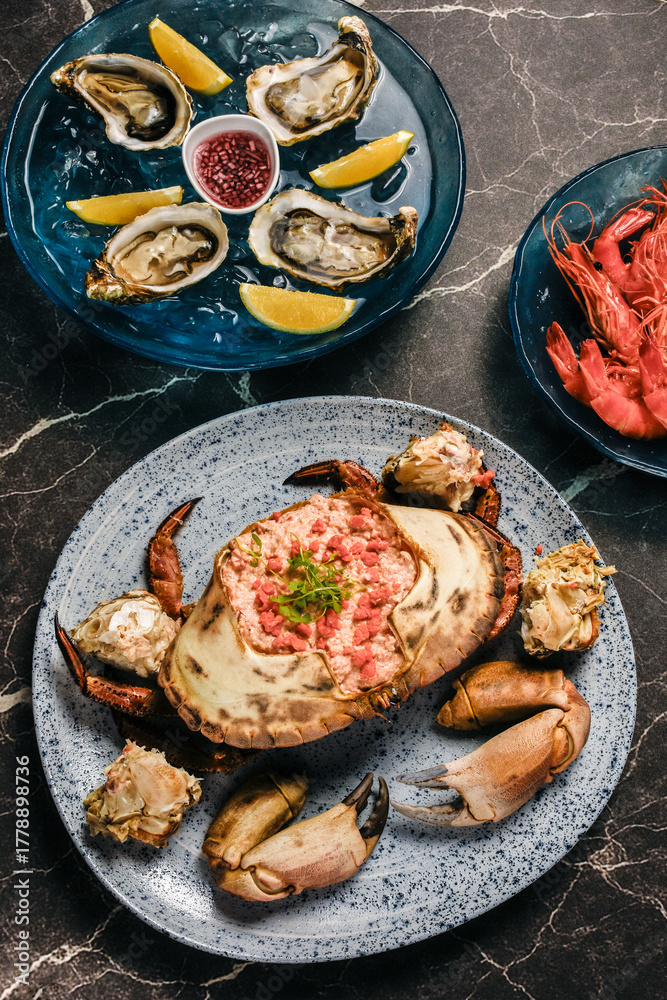 Sapateira Recheada traditional Portuguese stuffed crab meal with mixed seafood side dishes on gourmet restaurant table in Lisbon Portugal #1778898736