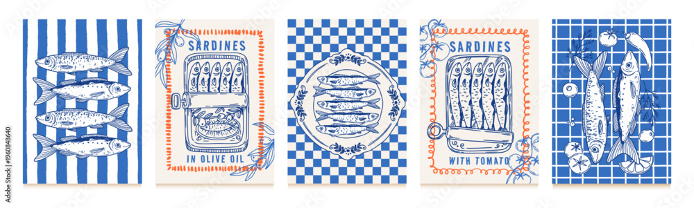 Sardines. Poster with seafood elements. Mediterranean fish on plate, sardine with olive oil, tomatoes, lemons, chili peppers. Italy food on banner for cafe menu. Vector set #1960848640