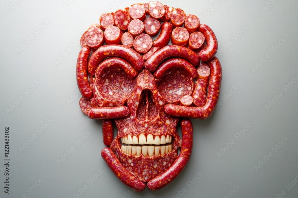 Sausage and salami forming skull shape, highlighting health risks of excessive processed meat consumption #1221433102