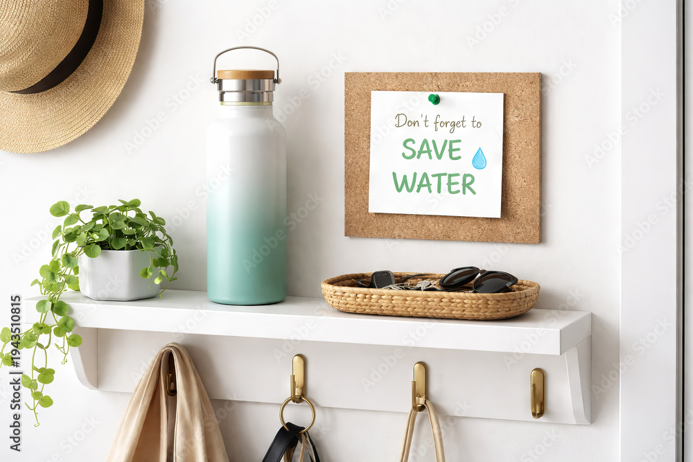 Save water note on cork board above white shelf with bottle and plant. Eco friendly habit reminder in entryway concept. Sustainable living and environmental conservation interior decor for home wall #1943510815