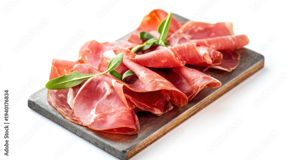 Savory Delights: Exquisite cured ham, artfully arranged, promising an explosion of flavor. Fresh basil adds a vibrant touch to this culinary masterpiece. #1940176834