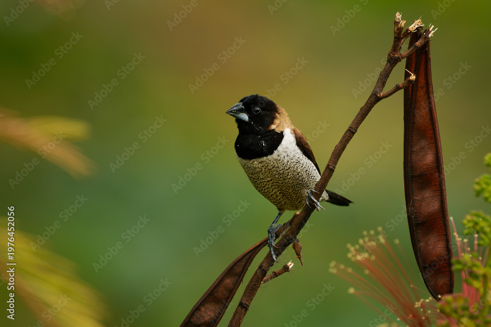 Scaly-breasted munia Lonchura punctulata perched on seed pod stem, black head, chestnut back, scaly white-brown breast, green bokeh background, Flores, Indonesia #1976452056