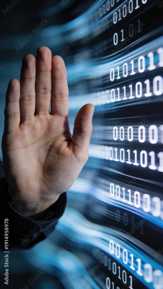 Scam alert ai cybersecurity warning defense awareness digital firewall binary code hand barrier fraud #1914958978