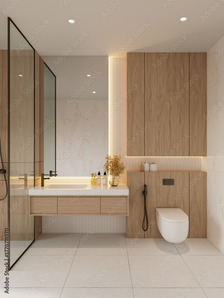 Scandinavian-style bathroom featuring a glass shower, wooden walls, and soft warm lighting. Clean modern design with simple lines and natural tones.3drender #1778711370