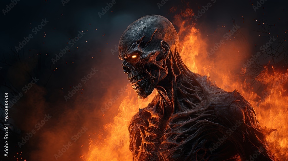 Scary angry demon from hell with glowing eyes and burnt skin against the backdrop of a raging flame. Horror stories for Halloween #633008518