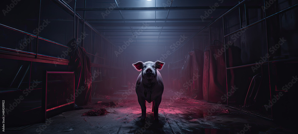 Scary looking hog standing in a purple lit horror room with a spotlight on the pig #684209922