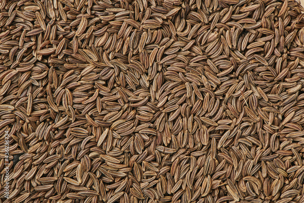 Scattered caraway seeds. Dried caraway seeds as food background. Pile of cumin seeds. Seasoning for food cooking of worldwide kitchen. Top close up view. #436236734