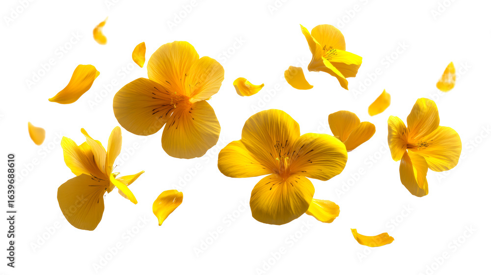 Scattered yellow flower petals and blossoms floating against a clean, white background #1639688610