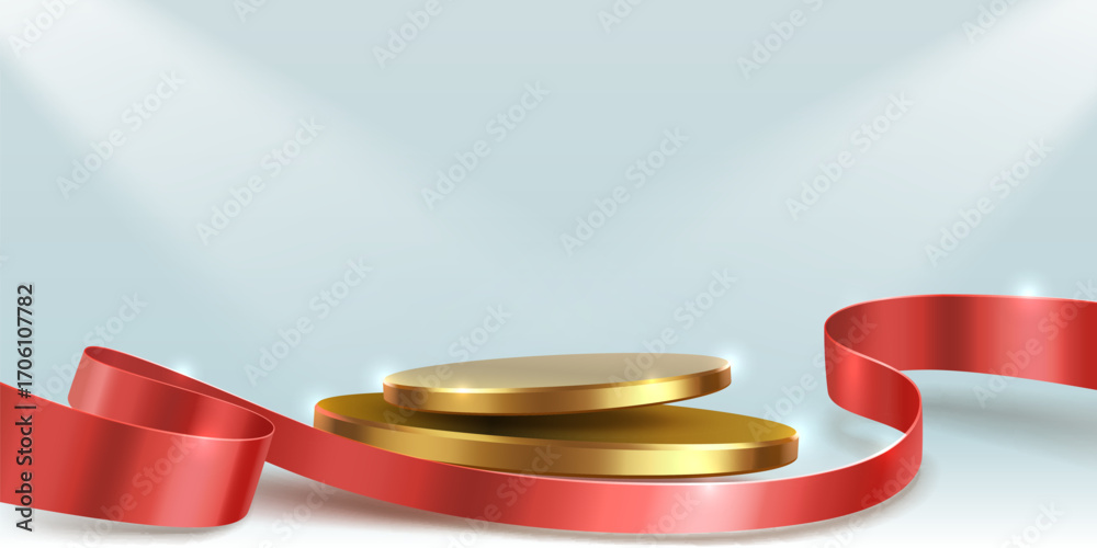 Scene ceremonies of the awards. Cylinder podium background ribbons. Product presentation, mock up, show product, Podium, stage pedestal or platform. Vector illustration #1706107782