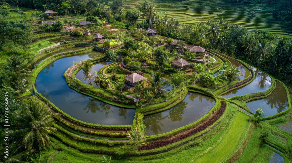Scenic Aerial View of Lush Green Rice Terraces Surrounded by Tropical Landscape with Water Channels and Traditional Houses in Tranquil Environment #1772434605