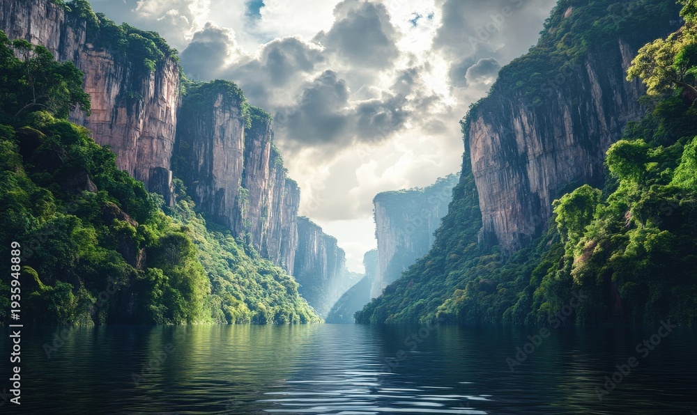 Scenic landscape of a calm lake surrounded by towering cliffs and dense forests under a cloudy sky creating a tranquil and secluded retreat 4k hyperrealistic photo #1935948889