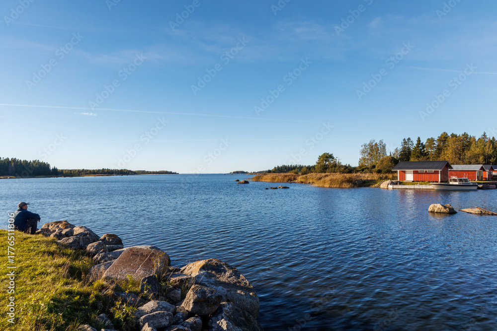 Scenic Nordic lakeside view with red wooden cottages, calm blue water, and a man sitting on rocks, enjoying peaceful autumn nature under a clear blue sky, symbolizing relaxation and solitude #1776511806