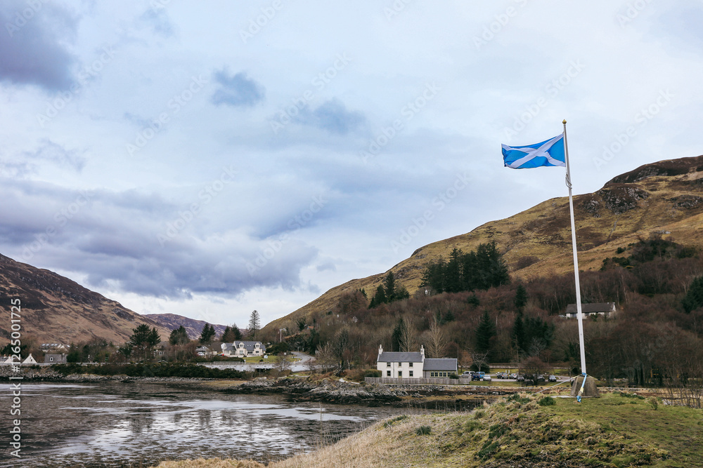 Scenic Scotland countryside with a flag waving by mountains and homes #1265001725