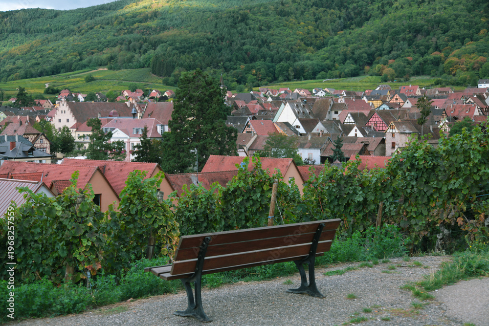 Scenic view of a village surrounded by vineyards and hills in France with a wooden bench #1968257559