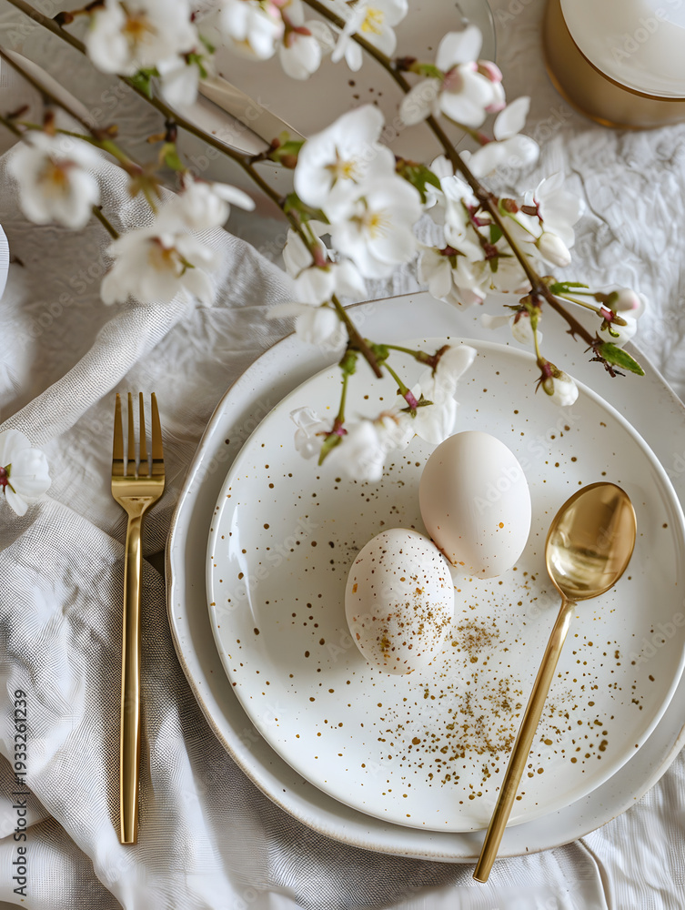 Schlichte Osterdekoration mit weißen Eiern und goldener Besteckkombination #1933261239