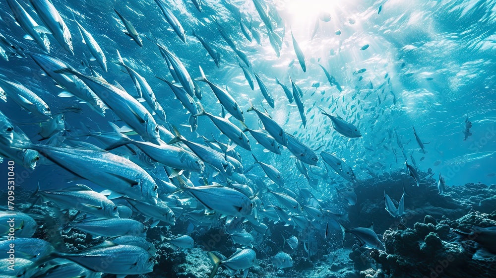 School of blue Indian Mackerel underwater along the dive site main marine life resources under the sea , Baa Atoll, Maldives. #709531040