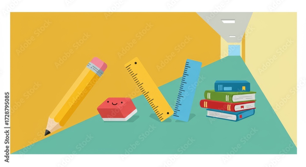School Supply Assemblage: A vibrant illustration of school essentials artfully arranged, symbolizing education and learning with a cheerful mood #1728795085