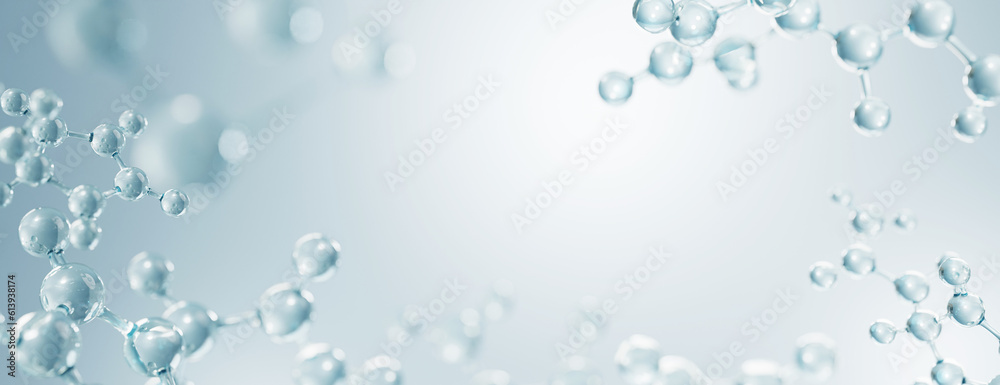 Science cosmetic, 3D Collagen serum and vitamin hyaluronic acid skin care solutions with cosmetic advertising background. #613938174