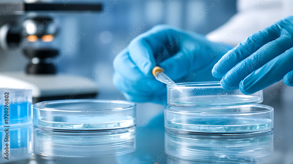 Scientist conducting laboratory experiment with petri dishes and pipette #1720276802